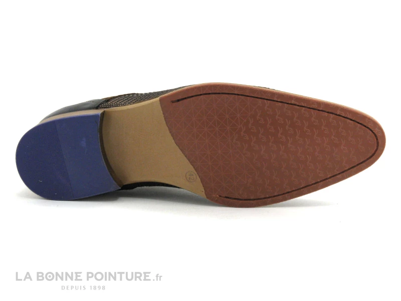 Cette chaussure habillée à pointe effilée combine des empiècement tressés, lisses et poinçonnés, aux tons de marron, de noir et de bleu.