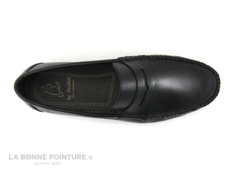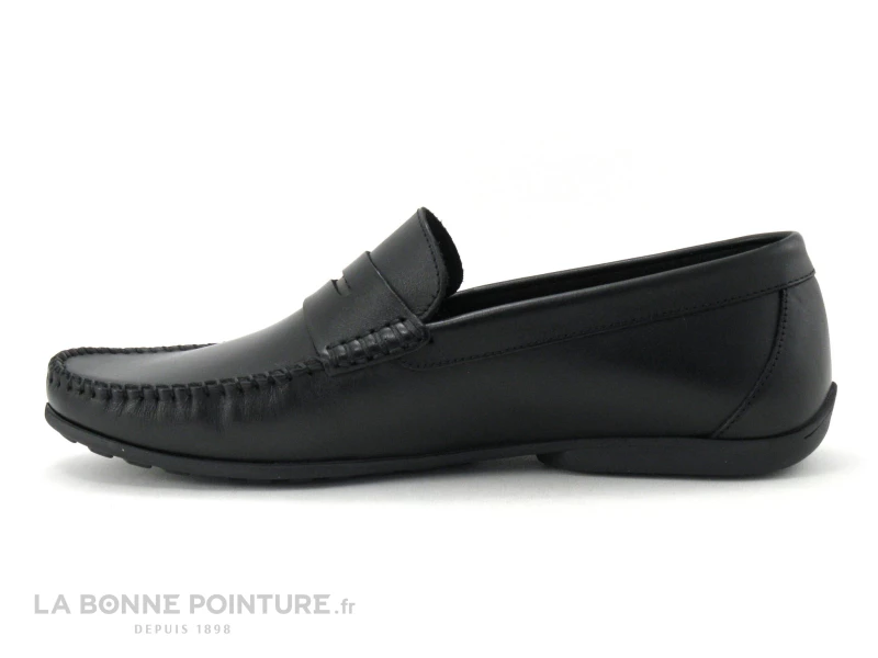 Ce mocassin souple Homme Dingo 7159 est en cuir lisse noir non doublé, avec couture apparente sur le devant de la chaussure.