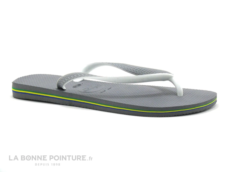 Ces entre-doigts Homme Logo Bresil sont gris et blanc, avec la marque Havaianas en blanc une une bride, à côté du drapeau brésilien.