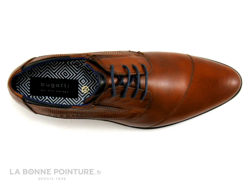 Un fin lacet bleu marine traverse 4 oeillets afin de fermer la chaussure Bugatti Homme.