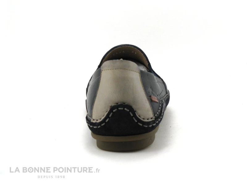 Ces mocassins Homme Fluchos sont en cuir souple bleu marine, avec le contrefort en cuir beige.