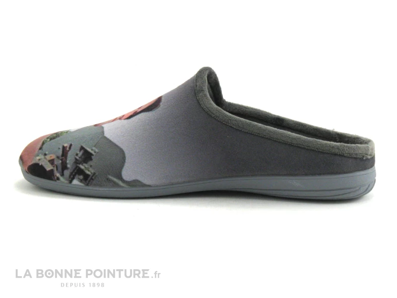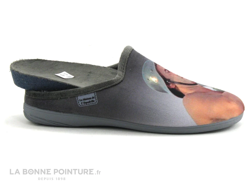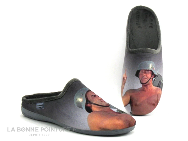 Cette pantoufle Homme est en velours gris, avec des scènes du film culte sur le devant de la chaussure, avec Jean Lefebvre et Henri Guybet.