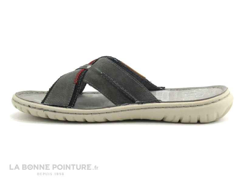 Cette mule homme est en simili cuir gris aspect grainé, avec une partie en denim noir et une couture rouge.