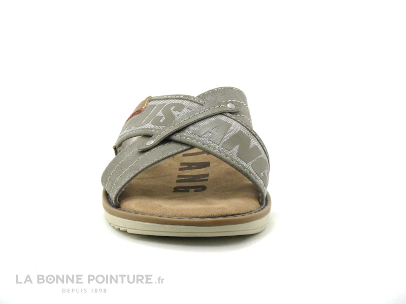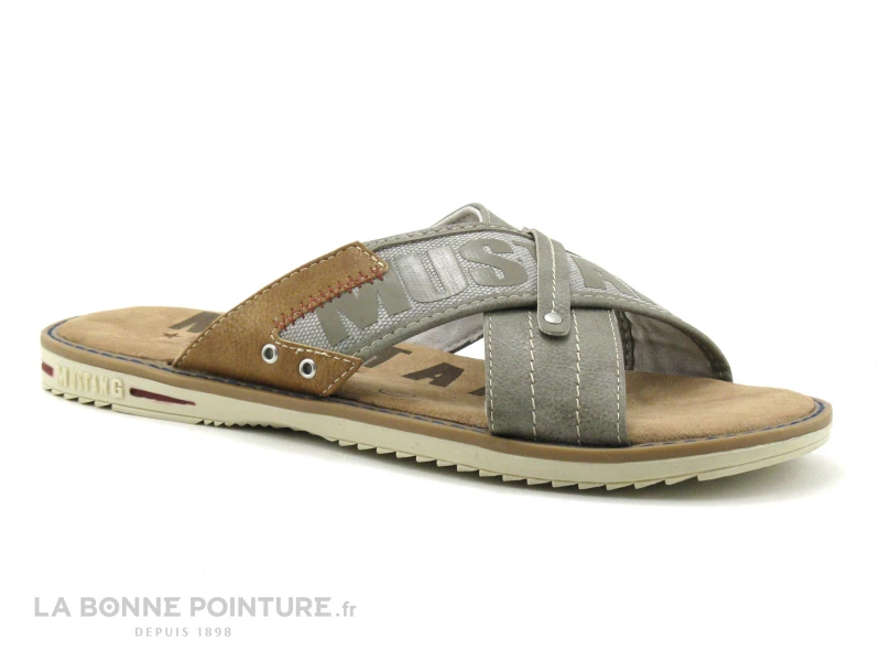 Cette mule Homme Mustang est composée de deux larges brides, aux tons de gris taupe et de marron camel.