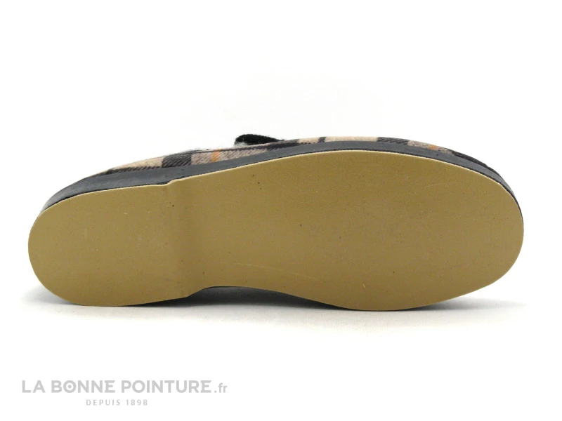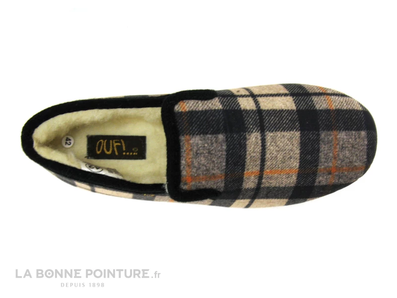 Ce chausson traditionnel Homme est en textile écossais, aux tons de beige et de noir avec une pointe d’orange.