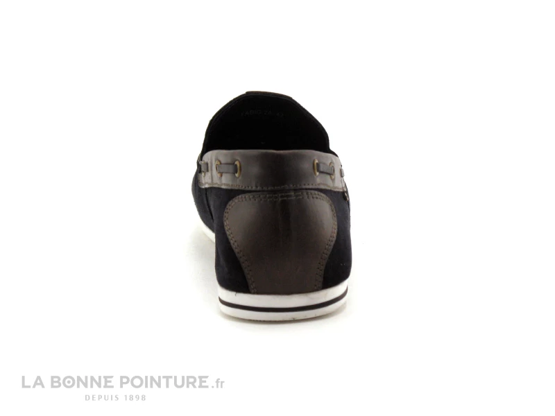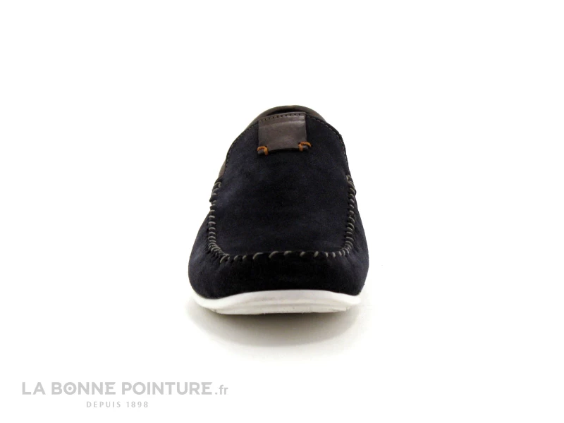Ce mocassin est en cuir velouté bleu marine, avec un peu de cuir lisse marron chocolat.