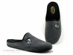 Ces pantoufles Homme pas chères Selkis 21514 sont en velours gris, avec un écusson sur le dessus.