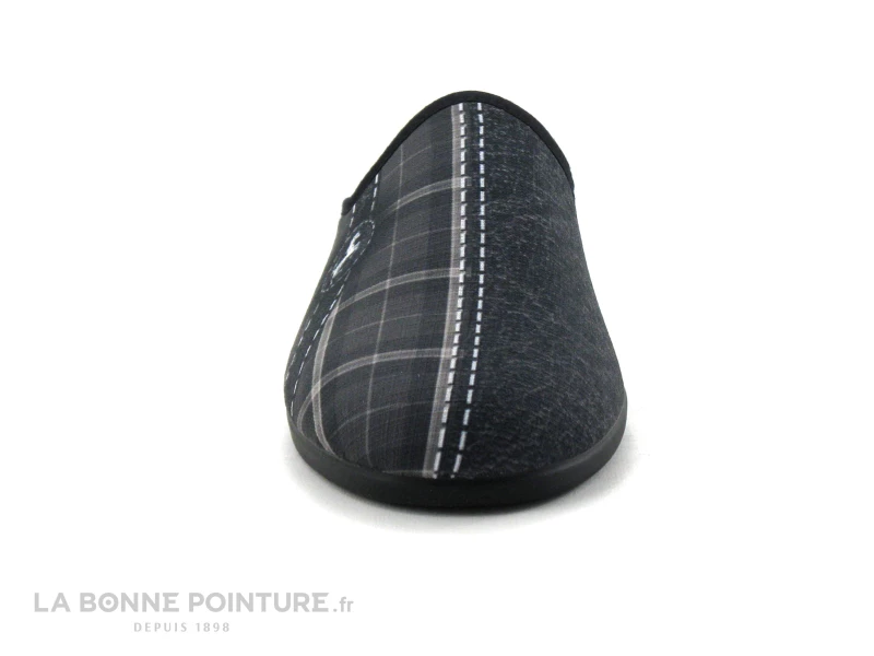 Ces mules d’intérieur sont en textile à carreaux gris foncé avec un peu de beige.
