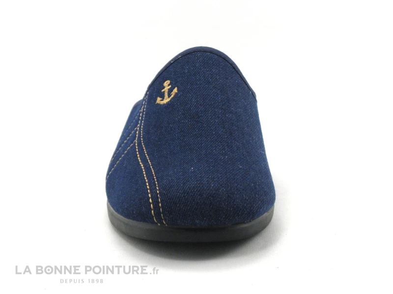 Ces mules d’intérieur Homme sont en toile bleu jeans, avec des coutures marron clair et une ancre brodée sur le dessus.