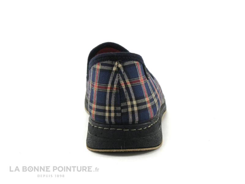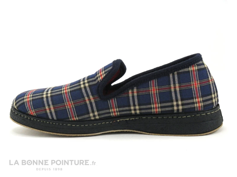 Ces charentaises Homme Semelflex Super Urbain sont en tissu écossais, aux tons de bleu marine, de rouge, de beige et de noir.