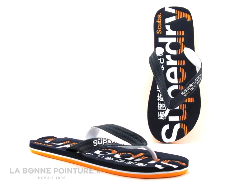 Ces claquettes Homme Superdry sont bleu marine, avec des touches d’orange et de blanc.