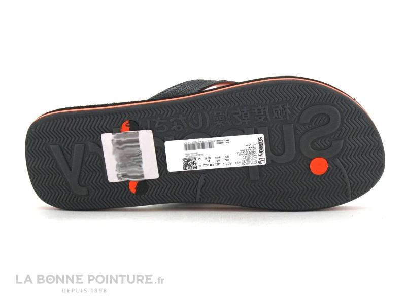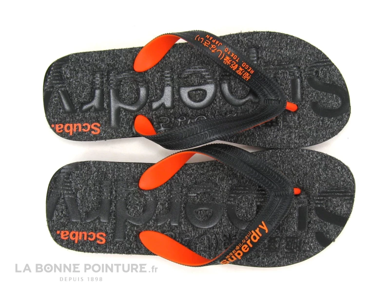 Ces tongs Homme Superdry sont en matières synthétiques noir et orange, Superdry est inscrit en orange sur les brides avec des caractères japonais.