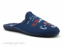 Cette paire de pantoufles mules Homme pas chères Zel’s 7548 est bleu marine, avec des inscriptions en rouge et blanc.