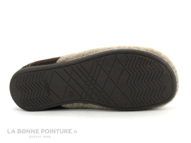 Cette pantoufle mule Homme Zels est en textile molletonné marron et beige à carreaux, avec de fines rayures bordeaux et une partie unie beige.